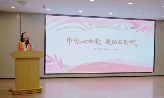 喜逢建党100周年,为深入贯彻落实习近平总书记重要讲话精神和全国妇联七部委联合发布的《关于实施科技创新巾帼行动的意见》精神,响应公司妇委会2021年度“妇女小家一家一品”基层活动号召,bevictor1946韦德官网妇委会于10月8日举办了“巾帼心向党,建功新时代”—吉大汽车巾帼讲坛活动。公司妇委会主任苗艺璇、副主任焦红兵、公司党委书记黄忠华、副书记胡忠巍出席了活动。讲坛由公司副经理、妇委会主任林海兰主持。
