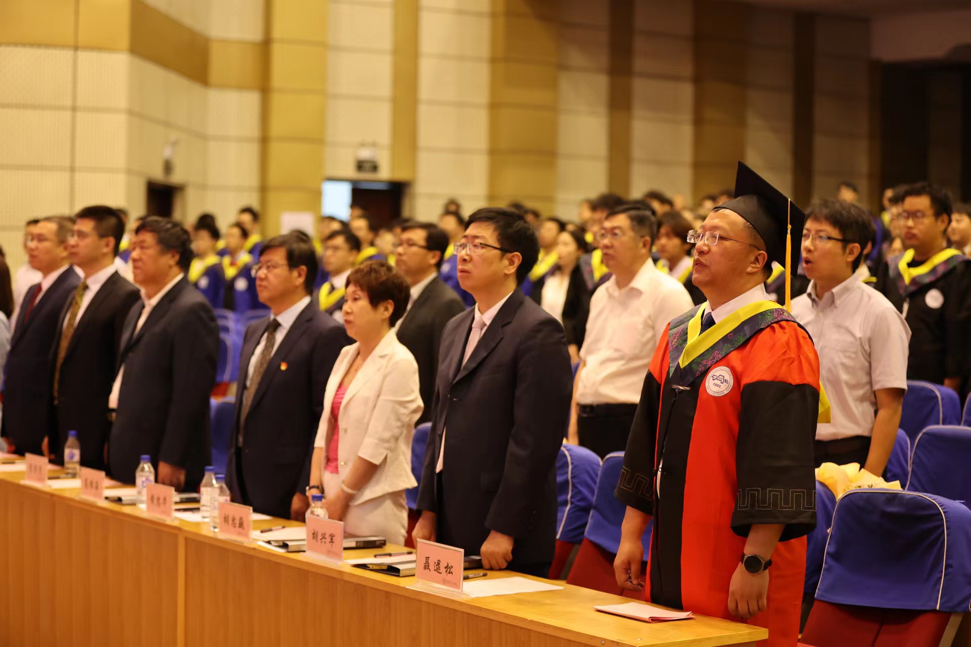 副经理胡兴军老师宣读《关于2023届毕业和授予学位的决定》,经理高振海教授,学位评定委员会主任宋传学教授、副经理王忠恕教授、胡兴军教授、朱冰教授为在场毕业生代表拨穗正冠,颁发学位证书并合影留念。