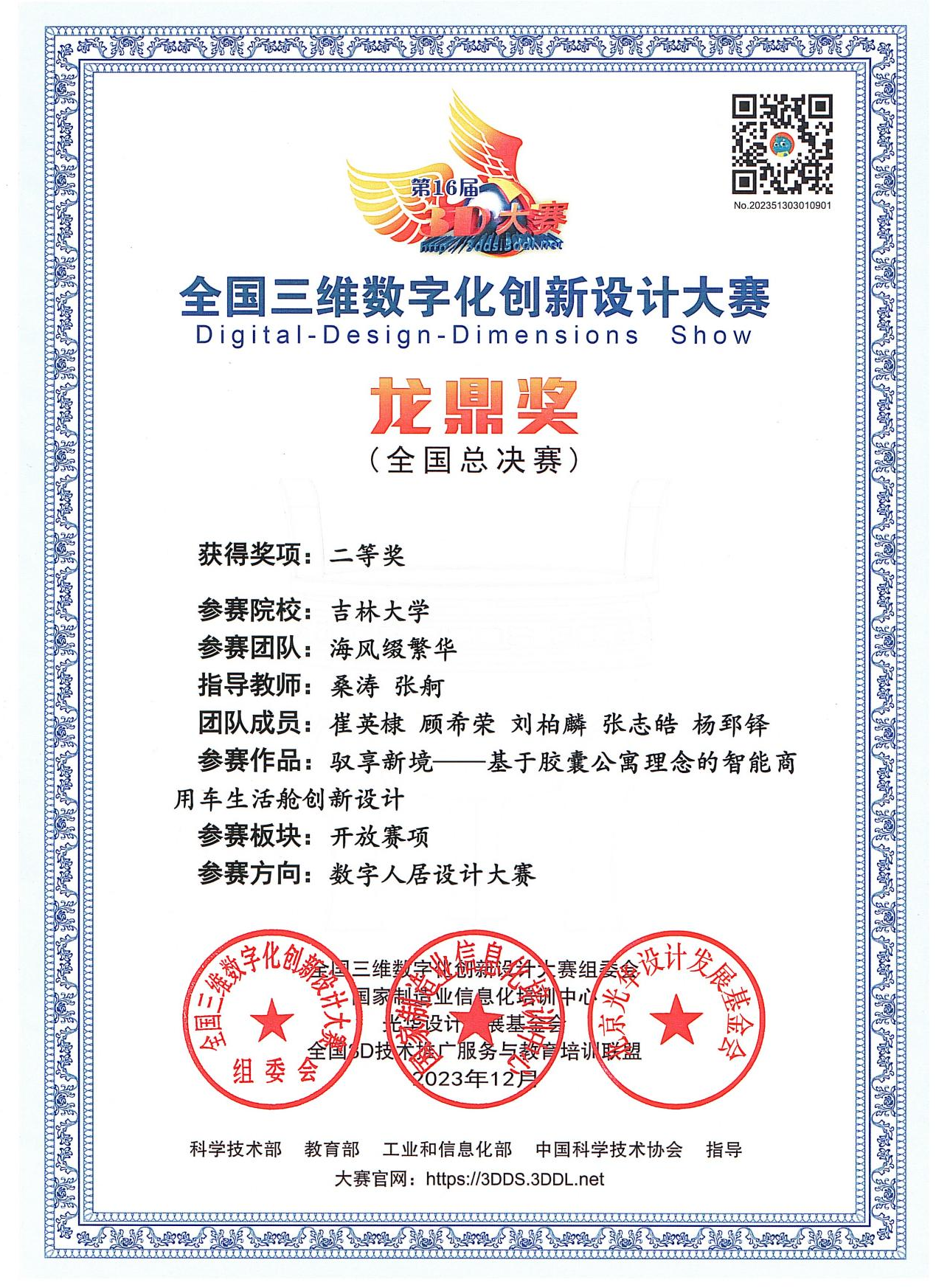 经过初赛和省赛的层层选拔,在指导老师和员工们的共同努力下,参赛队伍“海风缀繁华”的《驭享新境——基于胶囊公寓理念的智能商用车生活舱创新设计》作品荣获省级特等奖,顺利进入国赛,并在全国总决赛中荣获国家级二等奖。