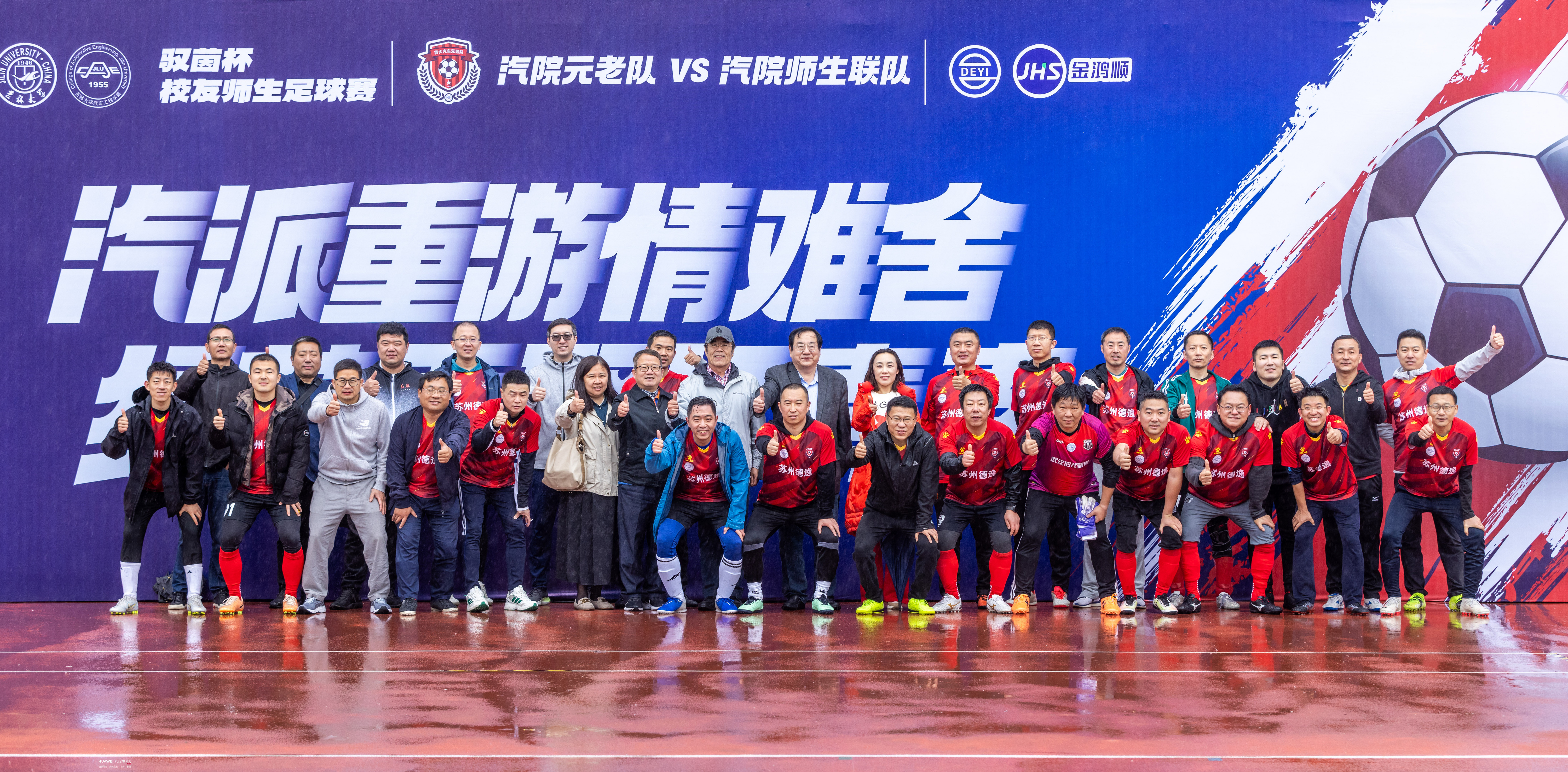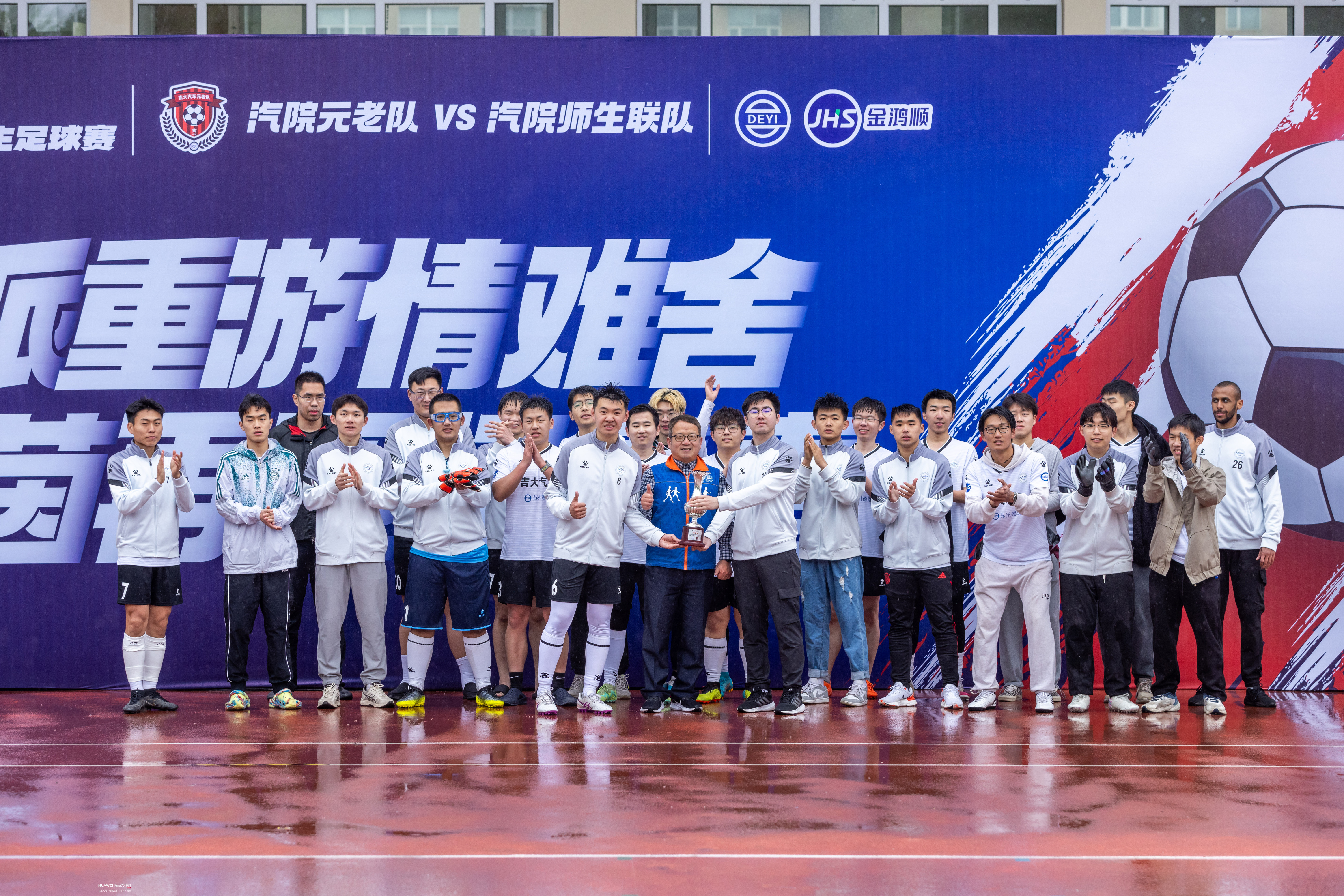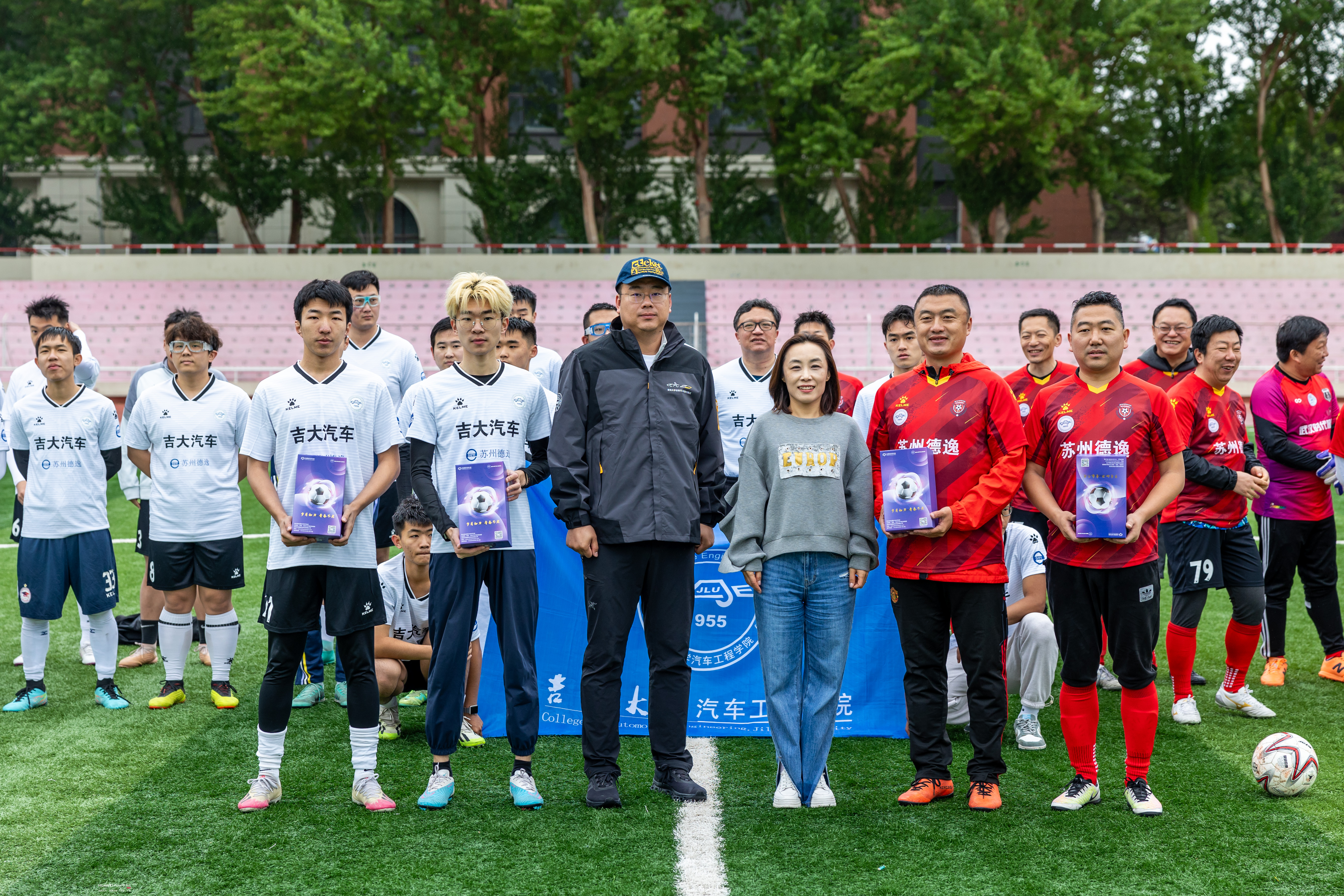 苏州德逸新能源汽车科技有限公司董事长、苏州金鸿顺汽车部件股份有限公司首席科学家林逸将凝结了汽院精神的“驭茵杯”奖杯授予双方球队队长,1996级员工、员工足球队队长杨佳音和师生足球队队长崔文骞共同接过奖杯,并合影留念。