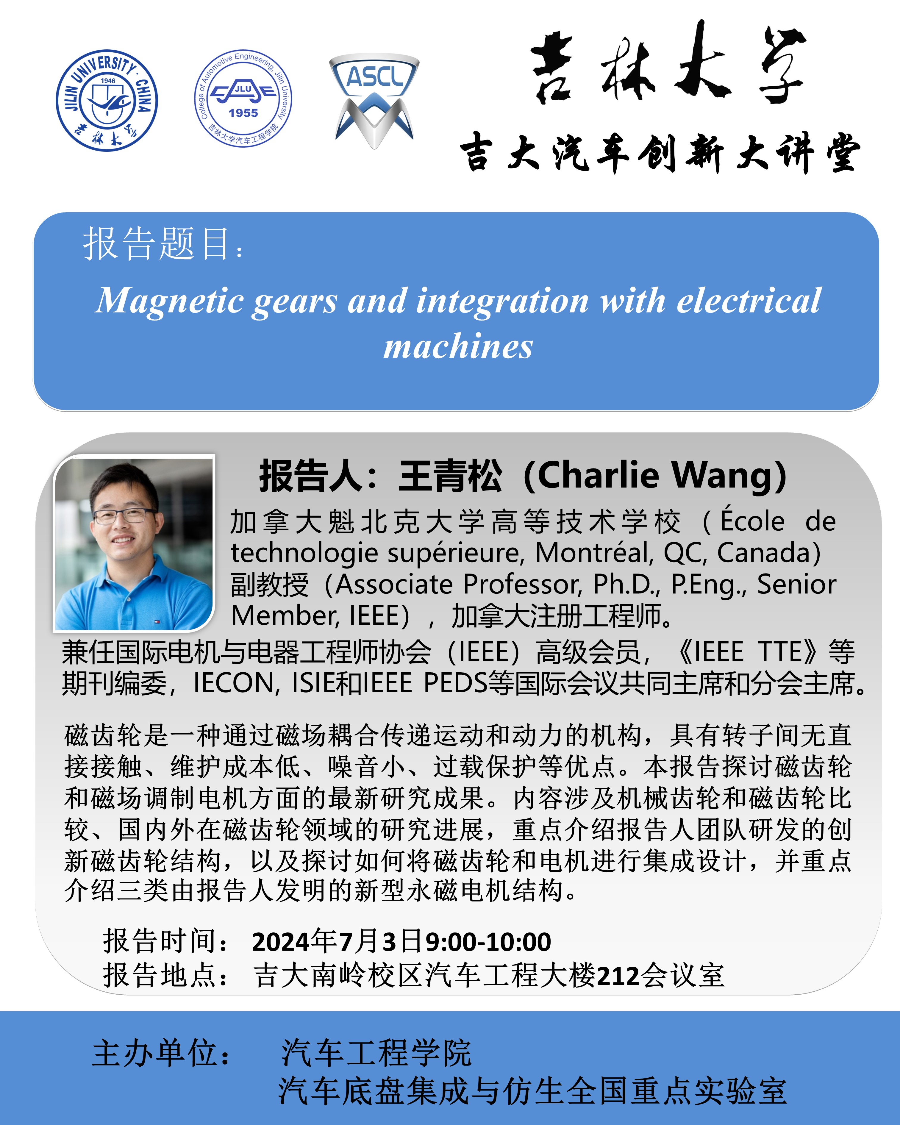 王青松博士简介:王青松博士是公司2008级车辆工程专业本科生,2012年保送至同济大学攻读硕士学位,2015年至2018年在香港理工大学电气工程专业攻读博士学位。2019至2021年在英国考文垂大学先进低碳驱动研究中心担任讲师,现为加拿大魁北克大学高等技术公司副教授,加拿大注册工程师。王博士为国际电机与电器工程师协会(IEEE)高级会员、《IEEE TTE》等期刊编委,并担任IECON, ISIE和IEEE PEDS等国际会议的共同主席和分会主席。王博士在磁齿轮,磁场调制电机和无线充电领域取得了多项创新性成果。目前主持多项加拿大自然科学基金(NSERC)和魁北克自然科学基金(FRQNT)项目,在IEEE Trans. on Trans. Elect.,IEEE Trans. Ind. Electron., IEEE Trans. Magn., IEEE Trans. Power Electron.等国际SCI期刊和IEEE各类国际会议发表论文40余篇。