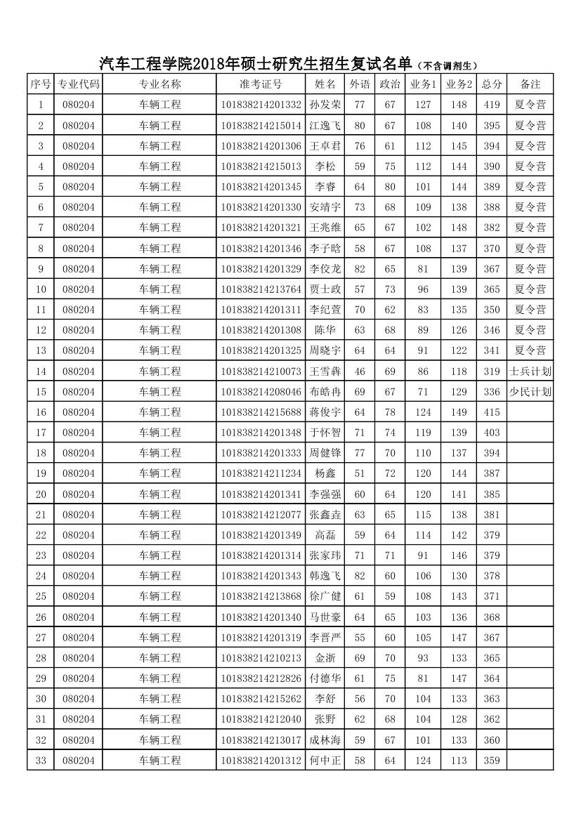 2018年硕士研究生招生复试名单(不含调剂生)