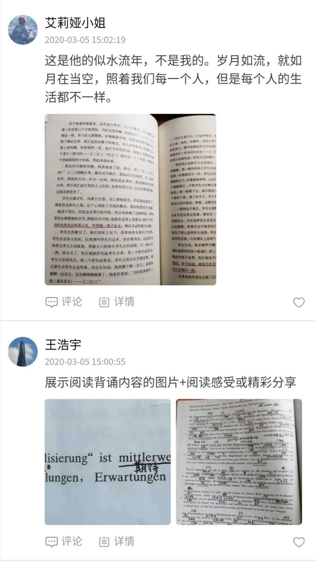 本次连续15天不间断读书打卡活动,要求同学们按照活动规定,每天将自己当天的阅读内容进行截图或拍照,并在规定的时间段内,进入程序打卡。通过每天打卡记录的方式,同学们可以相互激励督促,使参与者们在浓厚的阅读氛围中,养成每天坚持阅读的良好习惯。在网络授课期间,学习课本知识的同时,丰富个人内心世界,熏陶个人思想情怀,培养个人精神内涵。同学们积极响应,纷纷加入到此次每日一读的洪流中来,并以此活动为契机,在阅读中享受文字带来的精神满足。活动开始第一周,就有56位的同学踊跃参与了进来,覆盖公司全部年级和专业。同学们阅读的内容多种多样,古今中外莫不涉猎。