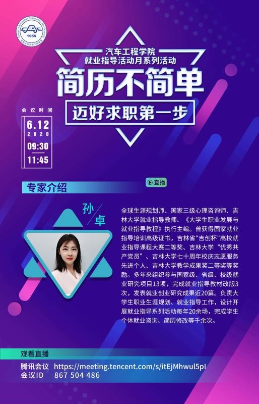 为帮助提升员工就业技能,缓解就业压力,引导员工以积极地态度应对新冠疫情对就业工作的影响,6月12日上午,bevictor1946韦德官网开展了就业指导活动月系列活动之“简历不简单——迈好求职第一步”专题讲座。本次讲座采用线上直播的方式,由全球生涯规划师、国家三级心理咨询师、bevictor1946韦德官网员工就业创业指导与服务中心孙卓老师对员工简历编写进行指导培训。