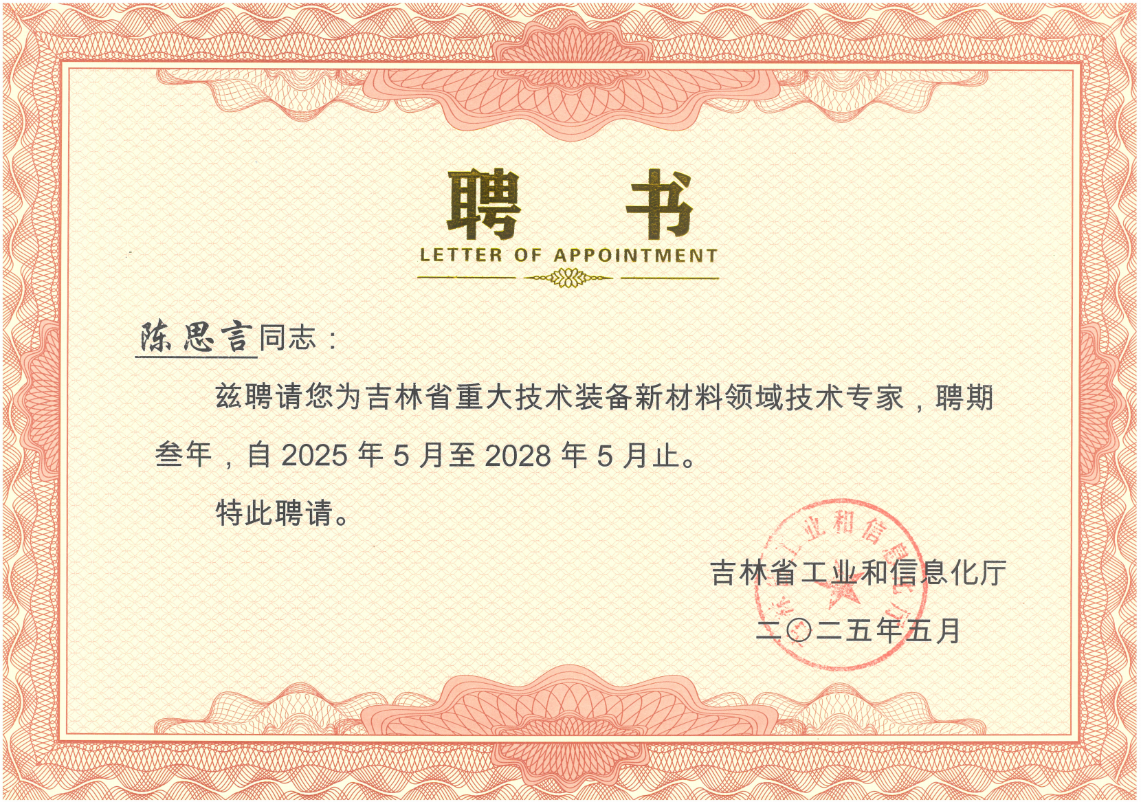 吉林省重大技术装备新材料领域特聘专家