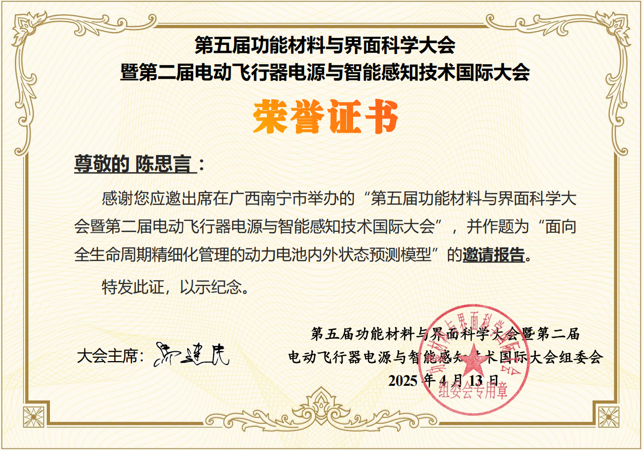 在学术服务与社会服务方面,担任Nature Communication、IEEE Transactions on Transportation Electrification、Advance Energy Material、 Reliability Engineering & System Safety、Journal of Power Sources、Applied Energy、Energy等期刊审稿人及客座编辑,担任工业与信息化部及一汽集团专家库专家,IEEE绿色能源技术专家(TPC)委员,担任多场重要学术会议的学术委员与组委会委员并作邀请报告。