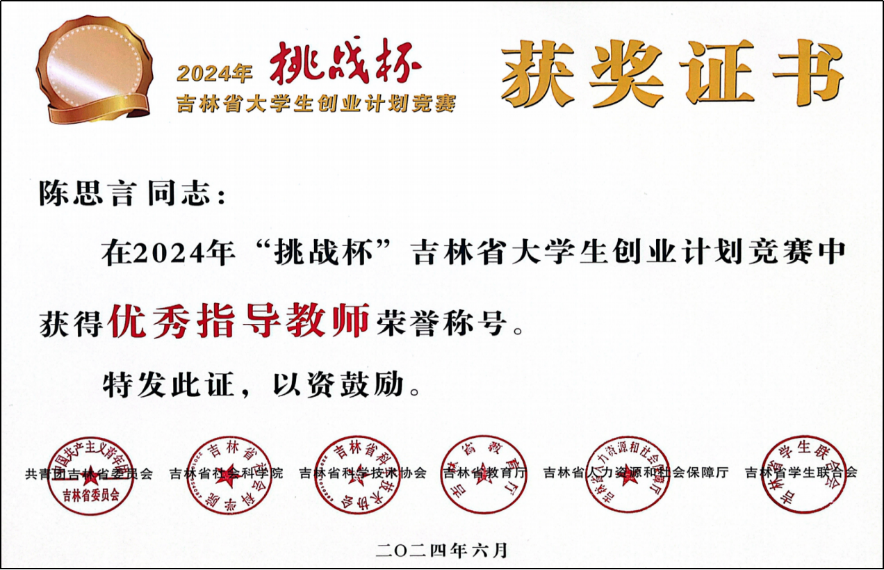 共青团2024年挑战杯“优秀指导教师”荣誉称号
