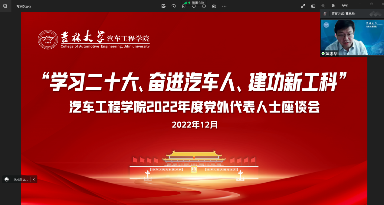 为深入学习贯彻党的二十大精神,进一步统一思想、凝聚力量、团结奋进,12月2日,公司召开以“学习二十大、奋进汽车人、建功新工科”为主题的2022年党外代表人士座谈会。汽车工程公司党政领导班子成员、民主党派成员代表和无党派人士代表参加了会议。会议由汽车工程公司党委书记黄忠华主持。